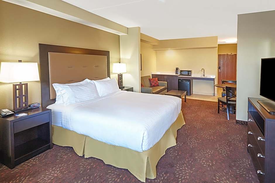 This hearing and disablity accessible room includes a flat-screen TV, desk and coffee machine.
